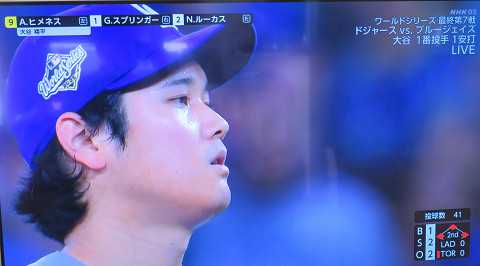 2025年11月2日(米国・カナダ1日)、大リーグのワールドシリーズ第7戦がカナダのトロントでありました。ドジャーズ、ブルージェイズ共に3勝で並び、この7戦目で勝ったチームが優勝者となります。テレビ中継に釘付けで、ドキドキしながら放送を見ていました。第3戦で93球を投げ、中3日で登板した大谷投手ですが、制球に苦しむ感じで、3回にビシェット選手に3ランホームランを打たれてしまいます。4回にドジャーズ、ブルージェイズともに1点ずつ入れて4対2となり、8回にはドジャーズのマンシー選手がソロホームランを打って4対3になりました。まずは1回から8回までのハイライトを紹介します。ーーーーーーーーーーーーーー↓ 先発は大谷投手。2回裏、先頭打者ビシェット選手の四球、バージャー選手のヒット、2死後にクレメント選手のヒットで満塁のピンチになったが、大谷投手はヒメネス選手を空振り三振に仕留めた。↓ 安堵の表情の大谷投手。ーーーーーーーーーーーーー↓ 3回表、打席に立つ大谷投手。↓ 残念ながら、レフトフェンス前で捕球された。ーーーーーーーーーーーーー↓ 3回裏の大谷投手。先頭打者のスプリンガー選手がヒットで出塁。↓ ルークス選手がアウトの間に、スプリンガー選手は2塁へ進塁。↓ ゲレーロ選手。↓ 大谷投手の球をスミス捕手が捕れず、その間にスプリンガー選手は3塁に。結局、ゲレーロ選手は申告敬遠で1塁に行った。↓ ビシェット選手。↓ 大谷選手の初球をビシェット選手が打った。↓ ボールはセンターに伸び、3ランホームランとなった。↓ ブルージェイズが3点先制。↓ 大谷投手。↓ がっくり肩を落とした。ーーーーーーーーーーーーーーーー↓ 4回表、1死満塁のチャンスに、ヘルナンデス選手の犠牲フライを打った。↓ 3塁からスミス捕手が生還し、3対1になる。ーーーーーーーーーーーーー↓ 4回裏、ブルージェイズの攻撃。大谷投手の次のピッチャー・ロブレスキ―投手が、ヒメネス選手にデッドボールを与えた。ヒメネス選手は激高し、ブルージェイズベンチから、選手やシュナイダー監督もグラウンドに飛び出した。ドジャーズベンチも、ブルペンからも飛び出してきて、大騒ぎとなった。結局、審判団から警告試合が発せられた。↓ ロブレスキ―投手の球がヒメネス選手に当たる。↓ 激高するヒメネス選手。↓ ベンチを飛び出るシュナイダー監督。↓ 双方がブルペンでもみ合う。↓ ロバーツ監督もベンチを出る。↓ ブルペンからも飛び出してきた。↓ 佐々木朗希投手も馳せ参じた。↓ 戻る山本由伸投手。ーーーーーーーーーーーー↓ 6回表、ドジャーズの攻撃。1アウト1塁、3塁で、エドマン選手登場。↓ エドマン選手が犠打を打った。↓ ベッツ選手が3塁から生還。↓ ベッツ選手生還で、ドジャーズ2点目。ーーーーーーーーーーーー↓ 6回裏、ブルージェイズの攻撃。クレメント選手を2塁に置いて、ヒメネス選手がヒットを打った。↓ 2塁からクレメント選手が生還。↓ ブルージェイスが4点目。ーーーーーーーーーーーーー↓ ブルペンでは、山本投手が練習していた。ーーーーーーーーーー↓ 8回表、ドジャースの攻撃。マンシー選手の打席。↓ マンシー選手がライトスタンドにホームランを打った。↓ ドジャース3点目が入る。
