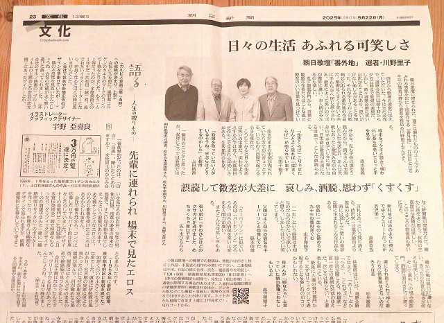 2025年9月22日付朝日新聞朝刊・文化欄に、朝日歌壇の「番外地」の記事があり、作品を読んで思わず笑ってしまいました。「朝日歌壇に寄せられた、選には漏れたもののユーモアあふれる秀歌を年に一度紹介する『番外地』。17回目となる今年の筆者は春から選者を務める川野里子さんです」とあり、川野さんの選ばれた作品が紹介されていきます。読んでいて思わず笑ったのが、脇本俊雄氏の作品です。父親はよく自らの病名をキーパーソンと自慢してた脇本俊雄川野さんのコメント。「キーパーソン」に似ているのは「パーキンソン」だろうか。自らの病気を笑いに変える人間力が凄い」。ーーーーーーーーーーーーー↓ 2025年9月22日付朝日新聞朝刊。↓ 父親はよく自らの病名をキーパーソンと自慢してた脇本俊雄