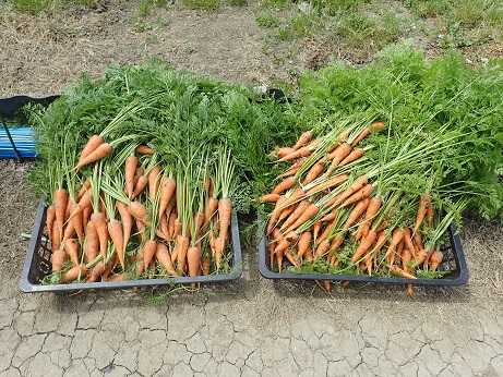 おはようございます。神奈川県”農業サポーター4年生”による実習レポートです!☆~葉山農園風景~☆<第1地区>(春夏苗の育苗地× 九条ネギ苗植え付け地)(タマネギ苗のトンネル栽培地 × 第2弾春夏ニンジン種まき地)(第3弾春夏ブロッコリー苗植え付け地 × 第1弾春夏ブロッコリー苗植え付け地)(第3弾ズッキーニ苗植え付け地× 春夏キャベツ苗植え付け地)(ソラマメ苗植え付け地 × 第1弾ズッキーニ苗植え付け地)(カボチャ苗植え付け地 × カボチャ苗植え付け地)☆~本日の作業風景~☆この日は、5月6日(土)最高気温26.7℃、最低気温19.4℃。前回は、オクラの発芽確認&スナップエンドウ&ソラマメ収穫など地味な農作業ばかりでしたが、今回は~?<春夏ニンジンの最終間引きをしよう~>⇒第1弾の春夏ニンジンの種まきを<第4地区>にしたのは、昨年の12月中旬頃第2弾の春夏ニンジンの種まきを<第1地区>に種まきしたのは~1月上旬頃第2弾の春夏ニンジンの発芽確認を行ったのは~1月下旬頃1回目の間引き&追肥を行ったのは~3月初旬頃2回目の間引きを行ったのは~4月上旬頃3回目の間引きを行ったのは~4月下旬頃今回は~最終間引きとなりましたよ~!!(1株1本立ち)(≧∇≦)b いいね♪<春夏ブロッコリー>冬播き春採りブロッコリーの種まきを<第4地区>に、直まきしたのは~1月上旬発芽を確認したのは~2月初旬頃春夏ブロッコリー苗として仕上がったのを確認したのは~3月上旬頃第1弾の春夏ブロッコリー苗を<第1地区>に植え付けたのは~3月中旬頃第2弾の春夏ブロッコリー苗を<第2地区>に植え付けたのは~3月中旬頃第3弾の春夏ブロッコリー苗を<第1地区>に植え付けたのは~3月中旬頃<第1地区>による第1弾、第3弾のブロッコリーの最盛期を迎えたのは~5月上旬頃今回も・・頑張って収穫してみましょう~!!<テーブルポテト>⇒新野菜!「テーブルポテト」の種まきをしたのは~2月中旬頃すでに~小さなポット内にて、ミニミニポテトが出来始めていて・・(*□*)ビックリ!!合計4株、無事に定植を終えました。。(*先日は、培養土の袋が足らなかったので追加しました)<第1弾ズッキーニ収穫>第1弾のズッキーニの種まきをしたのは~2月初旬頃発芽を確認したのは~3月初旬頃第1弾ズッキーニ苗を<第1地区>に植え付けたのは~3月上旬頃その後・・人工授粉を行ったのは~5月初旬頃収穫がスタートしたのは~5月上旬頃今回も、収穫をしてみましょう~♪おぉ-(o゚Д゚ノ)ノ☆☆~本日の収獲野菜~☆ヾ(≧▽≦)ノあははは!こんなにいっぱいのミニにんじん~どうするの?って思うかもしれませんが、これはコレで意外に使いどころがあるので、ありがたい~収穫です☆「頑張って、野菜つくれよっ」と応援していただける皆様、ランキングに参加しています。ポチっとクリックをおねがいします。いつも皆様の応援に感謝しております。毎日のブログ更新の励みとなっています人気ブログランキングにほんブログ村レシピブログのランキングに参加中♪ よろしければクリックしてくださいね♪