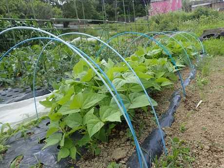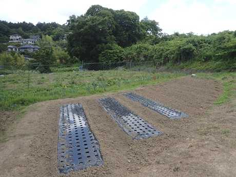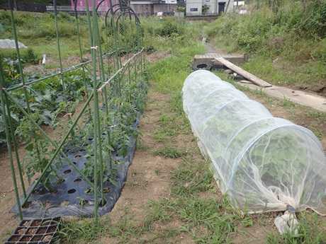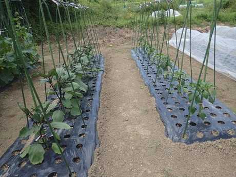 (第2弾トマト苗植え付け地 × つるなしインゲン種まき地 )