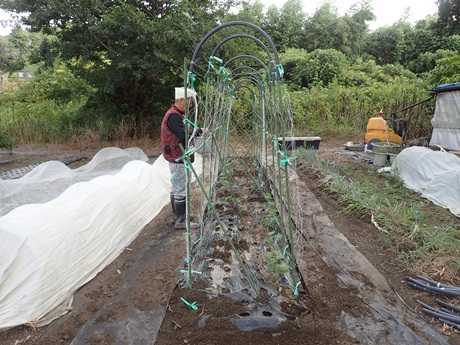 秋採りキュウリ苗の支柱立て&ネット張りを行ったのは~ 8月下旬頃