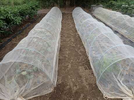 秋採りキュウリ苗の支柱立て&ネット張りを行ったのは~ 8月下旬頃