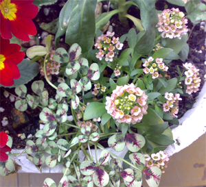 ヴィオラ、ラナンキュラスと共に寄せ植え。