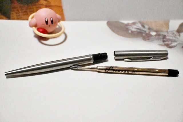パーカーのボールペンが出てきた記憶にないんだどこでもらった?だれからもらった?記憶にないです会社の何周年祝いとかファンクラブのノベルティとか可能性はあるけどまぁいいかいくらくらいするのかな*ノベルティグッズだと1500円だった替え芯は本家のものは高かったのでどうしようかと思っていたら代替品でもOKとのこと三菱のジェットストリームUNI SXR600-05調べて購入同じ形でした汎用性があるのでほかにも使えるらしい教えてくれた人ありがとう早速入れ替えたらちゃんと動いたしスムーズに書けましたありがとうねじ式?なんで自分で回さない限りペン先は出てこないからカバンに入れてても大丈夫かな替え芯はイオンで600円くらいしたかな高いけどまぁいいでしょう(*´∇`)ノシ