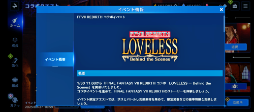 スマホゲームだけど きれいな画像で見せてくれる企画が時々ある今回はFF7 リバースのコラボLOVELESSの役者になるという感じでしょうか(知らないから)こういうとこでLOVELESS使うんだって思ってちょっとがっかりしてる私がいてるよあれはCCの中にだけでとどめてほしかったな悪役?にバレットとレッドレッドと戦うの嫌なんですけどねバレットはまぁいいでしょう髪の毛とんがってないクラウドに見えてしまった実際は逆立ってるね無印7やって CCやって もう一回無印見てみたらエアリスがあんまり好きでなくなってしまったんよねなんでだろティファはまぁナイスバディすぎて恥ずかしいって思っちゃった程度ですけど一緒に観ようって感じで演劇を見に行くはずが役者になって出演するってことか?なんやかんやでみんな練習して準備してるここで見ると役者の舞台裏って感じねお芝居は無事に始まって~(ケットシーかわいいよねぇそれぞれの役をこなして~(この衣装は実装されなかったこの衣装は実装されたバレットの服も実装された内容しらないからそうなん??って感じでスルーしてお話でしたみんなこの話に期待はしていないんよサブのサブというか全く関係ない話だから知りたいのはセフィロスの昔話なんだよーってことでイベント終了よく考えられてるけどパラレルワールドなので あんまり気にしてないかもしれない気にしない気にしないええんかいなと思いつつミッションだけこなしてます(*´∇`)ノシ