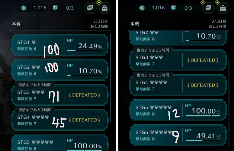 5月に入って一時30/30人になったけど4日未ログインの子を脱退させて29人になった29人のうち初日(去年の7月)から参加は23人 翌月参加は3人脱退してしまった子たちも初日メンバーだったんよね残念今回5月に新たに3人加入この子たちがまぁ 強いうちのギルド内ではトップ10に入っちゃうくらい強い戦力は偽装できるから入った時点ではわからないと思ってましたがギルドバトルではみんなの戦力持っている武器装備がちらっとわかるのでそれを見て判断 あとは何パーセントくらい削れるかという感じ自分の基準でこの子が入ってくれればーとか思うようになるでも自由にしてもらってるので(一切指示しない)好きなとこ削ってくれている手書き数字は私の削れる%1.2は100%(ワンパン)できたのでうれしかった自分の模擬戦の数字を見ながらどこに行こうかと悩む私は子どもと相談しながらどこ行くよ とか言いながらやってるでもギルマスとサブマスなんでみんなが残した 端数処理をしていることが多いこの場合stage1と2は私は余裕で終わらせることができるけど戦力的に50%ならいけるよって子もいてるから低いステージはそういう子にお任せしてる誰も入らなければ入るよ本来ギルドは相談しながらやるほうがいいんだろうけどそういうのが煩わしい でもソロでやってもポイントもたまらないじゃぁ無言ギルドに入ろうって感じかなって思いますなんやかんやで強い子が1人減って強い子が3人加入したらそりゃ 順位も上がるってことで350位から207まで上がりました報酬も変わってくるのでうれしいありがとう新規さん(*'ω'*)(*´∇`)ノシ