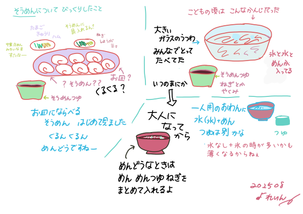 Twitterでそうめん論争が毎年起きてるそうめんでいいよそうめんがいいよまぁそうめんってゆでて冷やしてって面倒なんよね冷麺もそんな感じでもっと面倒食べるのは一瞬なんでそれもくやしいというかなんというか最近なんかの加減でそうめんの画像を見てびっくりしたよそ様のそうめんは 画像左具材たっぷりなのねそりゃ面倒ですわ私の作るそうめんはゆでて冷や水にさらしたそうめんをお椀に入れる(水なしの場合が多い)別椀のつゆに入れて食べるって感じかなくるんくるん巻いてるの謎一口サイズってことなのかな私ザルからてでサクッと取り分けるだけよくるんって巻いたことない見栄え大事にする人かもしれんねお皿に盛るのも初めて知ったよ具だくさん=冷やし中華 冷やし中華麺の時は甘い卵とか ハムきゅうり入れたりするけどそうめんでは全くないなぁって思ってよその人の写真眺めてましたここ数年主人のそうめんの食べ方が嫌いで全く作らなくなったよほぼ一口で食べてしまうのでなんか労力搾取されてる気がしていやになったなのでいてない日に食べるしかないいやいてない日がないから無理だえーん主人の実家にもっていってみんなで食べるのがいいんかもしれんね思い立ったので急に絵をかいてみました(*´∇`)ノシ