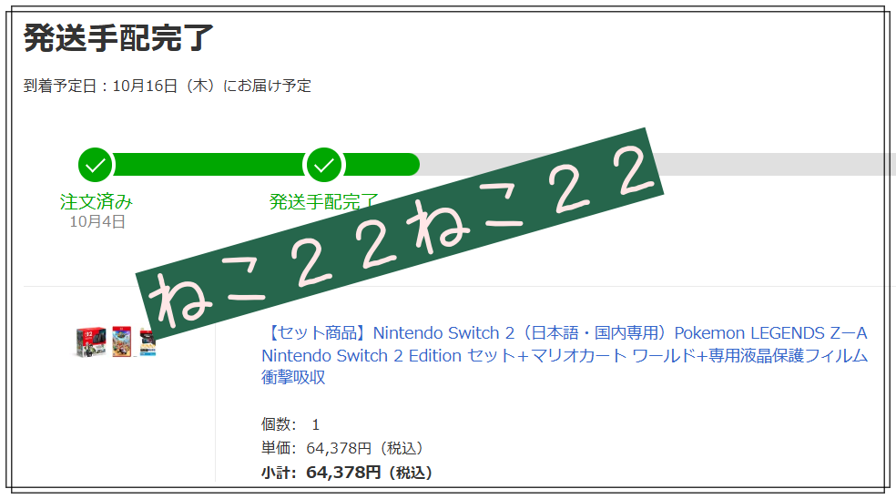 おそらく毎週ではないけど楽天ブックスで ゲリラ販売している楽天ブックスで購入できた人のレビューを読んでいるとだいたいが金曜日の21時から売り出していたよーって感じで書かれていた毎週チェックしていたつもりだったけど売っていなかった週もあったようで・・・いろんな曜日の21時にチャレンジもしてみたけどかすりもせずその前に注文抽選?というのが何か所かのお店でやっていたのでいろいろ申し込んでみてましたポケモンセンター2回ファミマオンライン(アプリを入れる)古本市場(LINE登録ドン・キホーテ アプリから申し込みジョーシン メルマガをとっている人にメールが来て予約抽選などなどいろいろできる範囲で敷居の低いところに申し込んでみてましたが全滅でしたね*ブログ記載時点で1つ残ってる ジョーシンまぁそれはよくって楽天ブックスで買えれば 安心だしラッキー10/3何度かリロードしてると購入ボタンが出てきた最初は何だったか忘れた英文字を入れている間に売り切れたまたリロードした今度は 英文字を入れても売り切れにならず購入できたようだちゃんとメールも届いてたで、私が買ったのは なんなんだろう?本体は見えたけど えーっとよく見ると本体+ポケモン(DL) +ソフト マリオカート+画面保護シールのセットで64000円くらいでした確か本体とポケモンセットで 54000くらい でマリカーは ソフトだと1万近くするのねっていうかなんで抱き合わせやねんって思いながらも購入できてよかったなって思うことにしましたそれにしても64000でしょ実際やりたいゲームはカービィのエアライダーでしょそのあとにFF7リメイクでしょっていう感じかなモンハンちょっと休むかもしれない10/16に到着するから初めてのポケモンやろうかなと思うマリカーは子どもと一緒に遊ぼうかなあとはオンライン。。。お金かかるなぁでも購入できてうれしいありがとう楽天市場楽天ブックスゲームの幅が広がるかな(*´∇`)ノシ