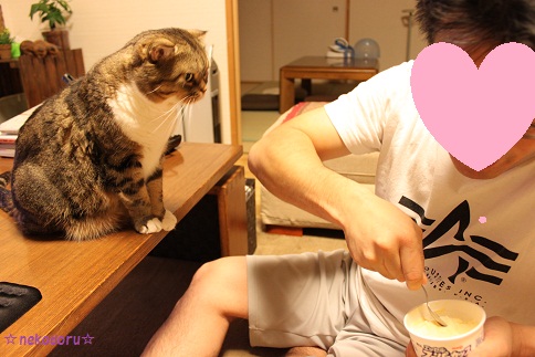 毎晩、夕食後のアイスがほぼ日課になってる我が家(笑)妊娠して以来、このアイスがやめられないでいます(;^ω^A でも、糖分の取り過ぎは注意なので1個をたぬ吉とワケワケです。お恥ずかしい話ですが、、、カップのアイスやピノの時はたぬ吉に食べさせてもらってるねこドル(〃 ̄ω ̄〃ゞエヘヘいや、一応言っておきますが食べさせて~(人´∀`*)っておねだりをしたワケではなくなんとなくたぬ吉がそぉーしてくれるので流れで甘えてます(* ̄∇ ̄*) で、カップのアイスを食べる日は必ずメイしゃんがやってきます。注)たぬ吉が半袖に短パンですが夏ではありません(笑)秋です。11月です。 めっちゃアイスに興味があるクセにアイスには興味ないよ~~~なフリして(笑)父にゃんのお手手をクンクン。 アイスには興味ないよ~ってフェイントでもかけたつもりかやっぱり興味があるのはアイス( *´艸`) 残念ながらバニラアイスに入ってるバニラビーンズはにゃんさんが下痢をする可能性があるのであげれないんだよね(´・ω・`)時々、フタについたほんのちょっとだけあげたりはしてるけど^^;なので、バニラの味を知ってるメイしゃんはバニラアイスが大好き。 ガン見です( ̄▽ ̄;) スプーンの動きからも一瞬たりとも目を離しません(笑) こんなにガン見されたら、、、ひじょーーーに食べづらいんですけど・・・( ̄∀ ̄;) ☆.。.:*・°☆ランキングに参加中☆.。.:*・°☆ いつもありがとにゃん(=^・^=)