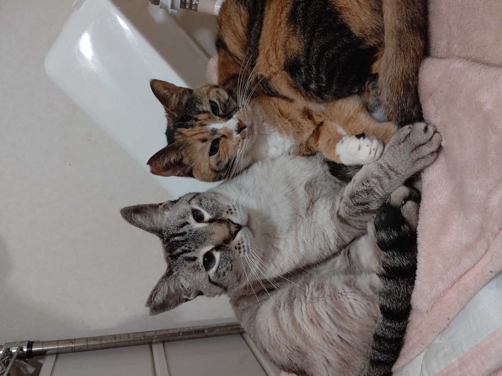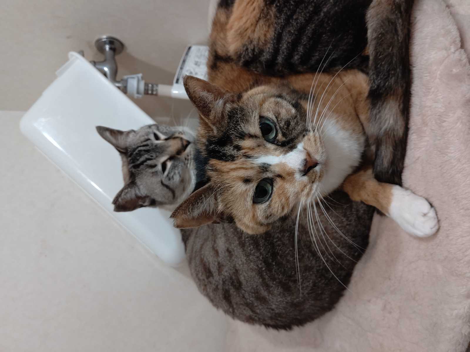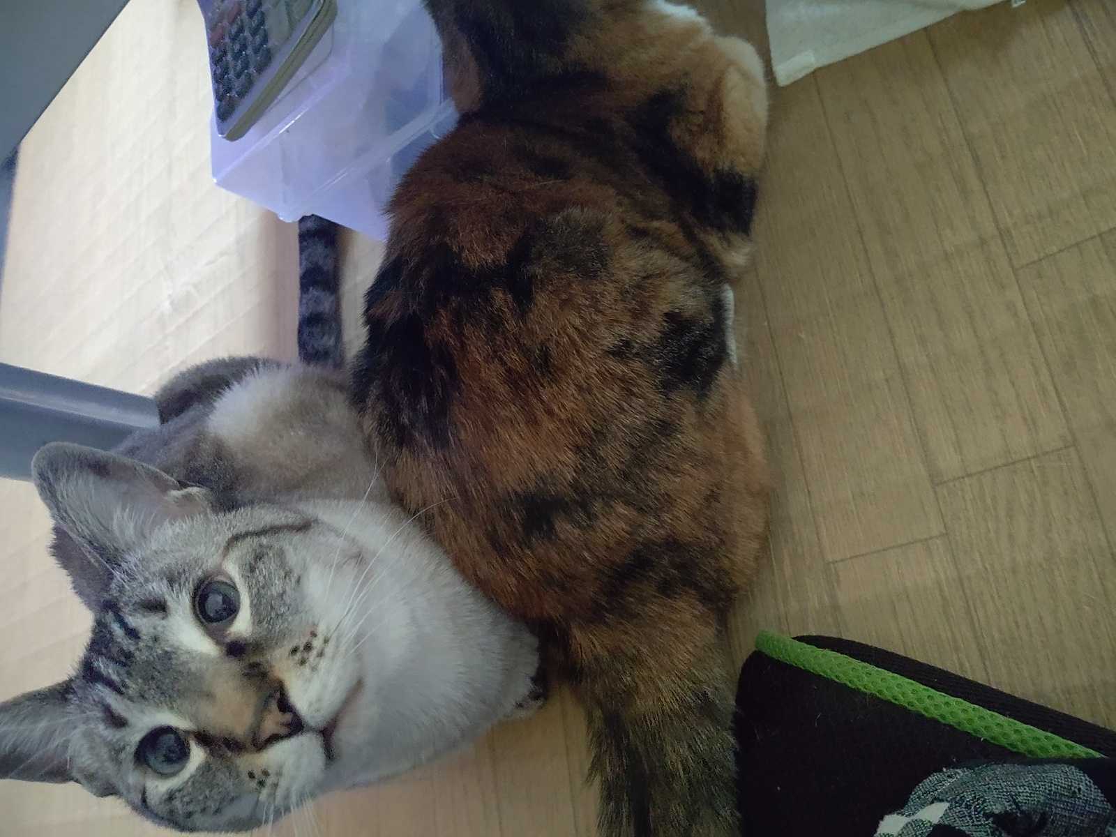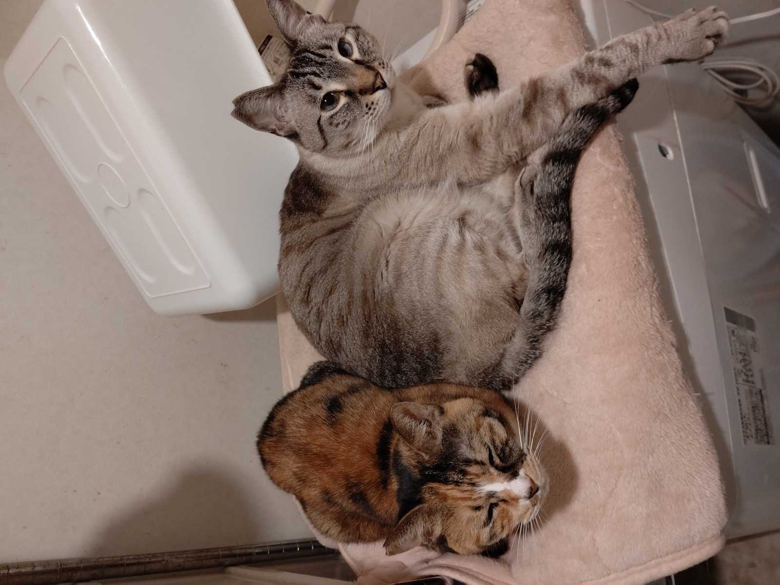 しばらく前に無理矢理布団を洗ったせいで古い洗濯機が壊れてしまい泣く泣く新しい洗濯機を買ったのですが、この御二方が洗濯機の上を気に入ったらしく、身体が痛くないように毛布を敷いたのですが、そしたらさらにその場所が気に入ったらしく、ずっと2匹で洗濯機の上に居ます。