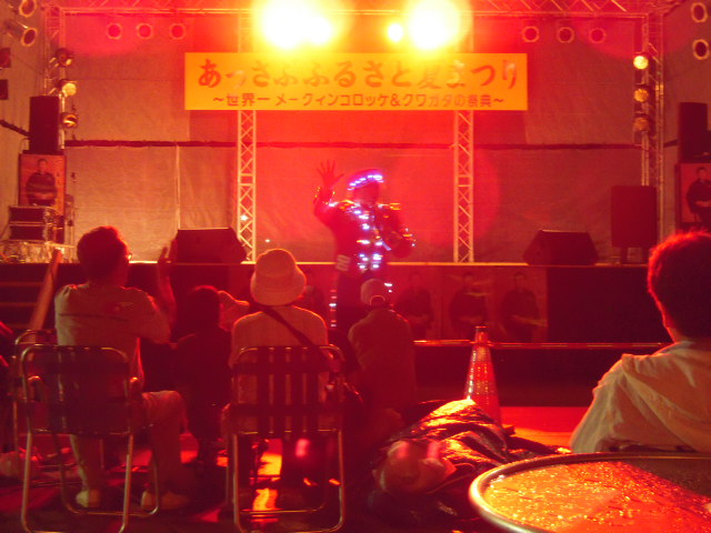 ・ 夜の部に電飾衣装着ますんで見にきて下さい!っていうお昼の部の最後の一言も猫又の気持ちをキャッチしますタ。あと、教育長さん自ら先頭に立って、地元中学生をステージに上げ一緒に盛り上がっていますたなあ^^何ン田さんも中学生たちに「とうさん。かあさん。大事にしてね。」と連呼^^:またアンコール2曲かかるのは異例のことだと司会のお姉さんも言ってましたなあ^^昼の部だけでなく夜の部もご一緒できて、何か嬉しかったです。