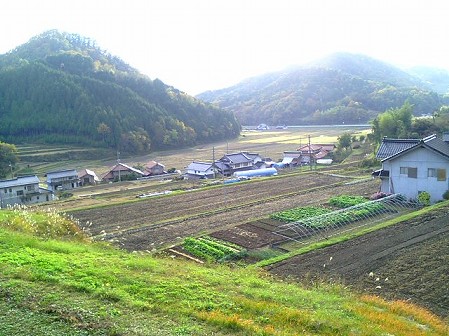 そろそろ実家に帰って半月くらい経とうとしています。あっというまなような、長いような。。。家にいると、当たり前ですが家族としか会いません。なんか、ちょっと退屈…かも。一人暮らしだと仕事以外じゃ誰とも会わないからそれよりはマシな気もするのですが…うぅむ;猫は思いっきり運動できて楽しそうでヨイ。しかしちょっと油断するとすぐ脱走する。脱走するからって扉閉めたら障子破って逃げやがった。。。張り替えなきゃorz仕方ないんで今はオープンです。真冬、絶対寒いんですけど…。今日は犬の散歩に行きました。んで、実家の裏の丘みたいなところから撮影。ワタシの実家はこんなところにあります。右にある赤っぽい屋根が我が家。稲刈り終わった後なんで非常に殺風景ですな。稲刈り前だときっと綺麗なんだろうけど。。ここらへんは今ごろが紅葉の見頃のよう。ちらほら赤いの、分かるかなぁ。この辺の山、植林が多いからあんまり綺麗じゃないのだけど;