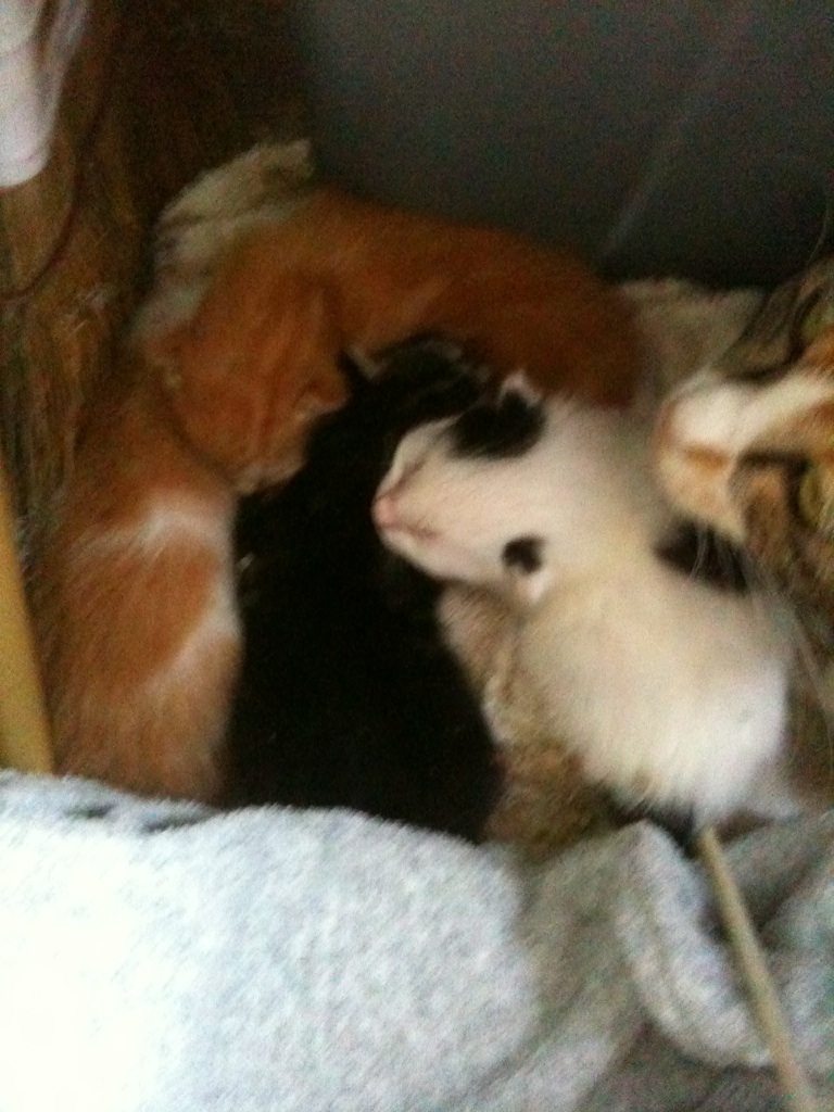 今朝のチビ猫たちぐっすりおやすみちゅう~休み明けの朝は慌しい靴ひもを結んでいなかった娘反省しながら穴に紐を通すそれを横目にマイペースの息子余裕で仔猫の様子を見にいく煮干しでお腹を満たしたママ猫仔猫の近くまで許してくれたちょっぴりねお布団替わりをプレゼント火曜日雲で覆われた空が悲しい明日は晴れわたりますよう一日お仕事頑張りましょ