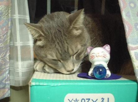 はじめに年頭のご挨拶を昨年はありがとうごがいました。今年もほとんどねこバカなブログですが、よろしくお願いいたします。昨夜遅くに実家から帰ってきました。古畑任三郎を観て帰ったので、実家を夜中12時に出ました。実家のお義父さん、お義母さんには遅くまで起きてお見送りまでして頂いてご迷惑をおかけしまいました。(^^;)いつもならもう寝る時間なのでとぉ~っても眠たそうな顔をされてました。 すみません。おかげさまでお正月休みはゆっくりと過ごす事が出来ました。今日も朝から、ダラダラと過ごしています。そんなことで明日から大丈夫なのでしょうか? ちょっと不安。たまも実家での生活に疲れたのでしょう。押入れでずーーっと寝ています。今年はお義姉さんの子供、ゆいちゃんが2歳になって元気爆発!!逃げるのに必死でした。でもそんなに激しくは無かったんですけどね。(^^;)子供は苦手のようです。またまた猫グッズ♪「買って」とおねだりすると主人が買ってくれました(^^)/風水猫。今年は良い事がありますように・・・・・。