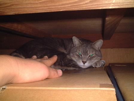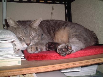 昨夜はたまにとって散々な夜だった。私&主人 : 「 ただいま~ 」 + もう一人 : 「 ・・・・・ 」たま :( あいつ誰ニャ?????? ) ( ニャに入ってきてるニャァ~???????? )もう一人とは主人の友達。 しかも、たまの苦手な人。 (お友達の為にもちょっと言い訳。たまはほとんどの男の人が苦手なようです。)(^o^;)トホホこのお友達、昨晩はうちにお泊りでした。お留守番で退屈しまくりなうえに、あまり相手にもしてもらえず最後には拗ねて、押入れから出てこなくなっちゃいました(^_^;)ゴメンヨ~ 私 :「 たまがこっちに来ないからでしょ~ 」 たま : 「 だってあの人、苦手ニャンだもん 」でも、ビミョーに遊びたい♪しばらくして見てみると・・・・・・ 拗ねたまま寝てしまってました~♪ カワイイ♪今日は店に行きたいのか?行きたくないのか?中途半端な感じだったので半ば強引に連れて行きました。4日間のお留守番のストレスと昨晩のストレスを発散するかのように楽しそうに裏の空き地を駆け回ってました~(^0^)/お昼寝する事も無く遊び回っていたので、さぞ満足した事でしょう。帰る時間になっても帰ってこないので探してみると、うちの軽トラの下に居ました。でも何だか様子がおかしくって・・・。キョロキョロと何かに怯えてる様子。いっこうに軽トラの下から出てこない。手を伸ばしてたまに触れると、小さくウ~っと唸る。捕まえようとすると反対側に逃げる。 (...の繰り返し)興奮させてはいけないのでゆっく~り、静か~に近づいて・・・捕まえる事が出来ました。外傷もないし、興奮?してる感じでもない。でも・・・いったい何があったのか? 店に戻ったら、すぐにお気に入りの箱で寝てしまいました。今日はたくさん遊んで疲れたのでしょう。 今も私の布団の上で熟睡中。明日はきっと休むだろうな。