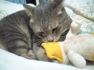 先日は皆さん、暖かいお言葉をありがとうございます。皆さんの励ましのお言葉、とってもうれしくって元気が出ます。が、今日もまた頭の痛くなる出来事が起こりました。お客さんも色んな方がいるので大変です。(><)今日の人には本当に参りました。自分中心の人には聞く耳が無いみたいです。主人も今日はとても気疲れしたみたいです。私もとっても疲れて頭がガンガンッします。でも、こんな事で負けてはいられません!! ( 自分に言い聞かせてる )こんな時は... たまちゃんに癒してもらおう (*^^*)疲れて帰ってきたのが分かったのか、ずっと側でゴロゴロ言ってくれました♪たまちゃんが居てくれてよかった~♪ ちょっと気分が晴れました。 アフロたま のはずだったのですが... 見えませんねぇ~ (^^;) さぁ、明日もガンバルゾ!! ( また、自分に言い聞かせてる )お友達のドナルドと格闘していま~す。 元気だね~♪たまちゃん☆