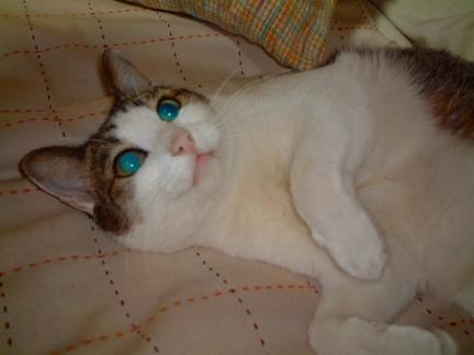 今日はいつも仕事でもお世話になっていて、お友達でもあるF君夫妻のお店兼家に遅いお歳暮を渡しに行ってきました。 遅いよっとってもいいご夫婦で、これまたネコ好き♪F君夫妻の家には2匹の家ネコと、1匹の居候ネコ(外ネコ)が居ます。その居候ネコが迷いネコの「チャッピー」。【去年の夏に撮影しました。この時は自由にお外で暮らしてました^^】迷いネコなのか捨て猫なのかは分かりません。2年半前くらいにここの家に住み着きました。家の中にも入れてみましたが鳴声が凄くてダメだったそうです。それでお外にチャッピーの寝床を用意してあげました。とっても人懐っこくて可愛い子。 初めて会った時も膝の上や背中に乗ってきて、ニャーニャーおじゃべりしてくれました(*^^*)ずっと外ネコとして暮らしてきましたが昨年末、近所の恐そうなおじさんの飼っている鳩をチャッピーが殺したという疑いがかかり今度見つけたらタダじゃ置かないと...チャッピーの身の危険を感じたF君夫妻はチャッピーの為に小屋を作ったそうです。今は立派なチャッピー小屋(とっても広い)で暮らしてます。食いしん坊のチャッピーはご飯さえ食べられてナデナデしてもらえればそれでいいみたいです(^▽^) かわいいチャッピー♪ (これはチャッピー小屋の中、大人3人入っても広々です♪) 「 ボク、チャッピーよろしくニャン♪」