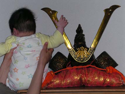 お待たせしました!(って、誰も待っていないですね)ジュニアの初節句のご報告です。今日はうちの母と嫁の父がお祝いに駆けつけてくれました。大したことはしていません。僕からジュニアに受け継いだ兜、義理父からいただいた鯉幟、それらの前で記念撮影の雨霰でした。そんなわけで、ジュニアはげんなりそれでも健気なジュニアは、頑張って笑顔を振りまいて、いろんな人に抱かれ、いろんなポーズを強要され、いろんな写真を、いろんなカメラで撮られていました。ごめんよ、ジュニア。でも、本当に、僕はめちゃめちゃ嬉しかったのだ。だって、君の初節句をこーんな晴天で迎えられて、おまけに、生まれたときのトラブルを考えると、感無量で・・・もう、嬉しくて嬉しくて、たまらないのです。で、最後はやはり菖蒲湯ですよね。ということで、一緒に入りました。さて、そこで、みなさんに質問なのですが、菖蒲湯を入るときに、お風呂に菖蒲を入れて入浴するのは当然として、他に、なにかしますか?元々僕の方は東京の田舎出なので、特にそういう儀式はありません。嫁父の田舎では、なんでも菖蒲を体に巻きつけるとか・・・で、とりあえず、お風呂の中で、菖蒲でジュニアの体をペンペンしてみました。お祓いみたいな感じですかねぇ^^;で、体はよかったのですが、頭をペンペンしたら・・・ジュニア、大号泣でしたそりゃそうかもですよね。生まれて、初めて、植物が頭を襲ってきたわけですから、驚かないわけがありません。最後まで、ジュニアに面倒をかけっぱなしの、初節句でした。で、予告しました、兜の写真です。ジュニアの後ろ姿のおまけ付きです。ジュニアと比べてもらうと、大きさがわかると思います。獅子頭付き、義経タイプの南部鉄の兜です。ジュニアの後姿も素敵でしょ^^;ぼちぼち、ジュニア写真も載せていく予定です