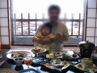 紋屋さんには、4時くらいに到着さすがに、赤ちゃんに優しいを標榜というか、コンセプトにしている宿だけはあります。宿の人、全員がジュニアの名前を確認して、宿にいる間中、ずっとジュニアだけは、名前で呼ばれておりました。他にも赤ちゃん連れのお客さんがいたのですが、みなさん、同じように、ベビーは名前で呼ばれています。そして、従業員の方、なにかしてくれるときだけでなく、廊下ですれ違う瞬間さえ、ジュニアに対して、手を振ってくれたり、ニコニコと相手してくれるのです。いやはや、女将さん、このサービスには、頭が下がります。さて、宿のお風呂場が入れ替わる関係で、まずは嫁が入浴。その間、ジュニアと近所を散歩です。なにせ、目の前が岩場の海岸。早速、探検と行きました。そして、ジュニアに海を見せながら、「ジュニアよ、世界を舞台に云々かんぬん・・・」などと講釈をたれていたのですが、海などには興味を全く示さないジュニア、僕に抱かれて、爆睡君でしたで、ジュニアのお風呂や寝る時間を考慮して、6時から夕飯です。ちなみに、宴の料理は↓こんな感じ。晩ご飯は部屋食でして、部屋からは海が一望です。僕らの食事はたいへん満足いくものでしたが、ジュニア用の離乳食もかなり美味しかったです。え、なぜわかるかって・・・? あまりにジュニアが美味しそうに食べるので、味見しちゃいましたから^^;ちなみに、離乳食は事前の4つのメニューの中から、選択して予約します。この日の晩ご飯は、これ↓ジュニア、本当に美味しかったみたいですよ。ペロっと平らげていましたから。おまけに、おかゆも付くのですが、こちらもバクバクと食べていました。で、懸案だった数々のことなのですが、ジュニア、全然問題ありませんでした。さすがに、宿に着いた当初は、ここはどこ?みたいな感じでしたが、仲居さんをはじめ、みなさんが優しく、また相手をしてくださるので、ジュニア、すっかりご満悦。人見知りすることもなく、おまけに、夜も爆睡しておりました。なぜ、そんなに、いつもと変わらないのだ!?嬉しいやら、謎やら・・・全く、ジュニア、大したものです(バカ親ーズです^^;)他のお客さんの赤ちゃんは夜泣きやご機嫌斜めがあったらしいのですが、そんなこともない上に、愛想がいいジュニアは、宿のみなさんにもすっかり気に入られたようです。本人的には、あんなに美味しいものを食べられて、こんなに歓迎されるなら、ずっとここにいてもいいぞ!みたいな感じなのではないでしょうか・・・^^;いやはや、心配が杞憂でよかったのですが、全然大丈夫だと、それはそれで物足りないのは、なぜなのでしょうね・・・^^;ということで、明日は、旅行先でのお出かけ編です