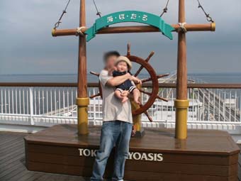 ごめんなさい。昨晩中には、宿に到着しませんでしたさて、そんなわけで、予定時刻を大幅に遅れて出発しました。当初の計画では、途中で2箇所くらい、休んだり、観光したりを考えていましたが、宿到着を早めにしたかったので、休憩1回に変更です。行き先は、紋屋さん。南房総の白浜です。横浜からですと、やはりアクアラインが便利です。金額は張りますが、ジュニアのためには仕方ありませんそして、館山道が運良く、7月4日に全線開通したので、富浦まで高速及び自動車専用道路を通っていくことにしました。予定走行時間は、余裕をみて、2時間30分くらいです。途中の休憩ポイントは、アクアラインにある「海ほたる」にしました。予報では悪かった天気も、晴れ男パワーの面目躍如で、太陽が出てきました。記念にジュニアと撮った写真が↓です。ちなみに、海ということを意識したわけではないのですが、ジュニアが当日着ていたのは、「夏物☆チャイルドチャンプ【CHILDCHAMP】水兵さんマリンロンパース♪」です。左の青い方ですね。一応、イメージは海の男、ジュニア、でございました「海ほたる」では、ミルクを上げたり、オムツを替えたりして、1時間以上過しまして、宿へ向かって出発です。で、車中のジュニアですが、基本、寝ていました。いや~、車の揺れが心地よいのか、しっかり寝ちゃってくれてました。そんなこんなで、移動中はジュニアネタもなく、無事に、宿に到着しました。宿でのお話は、また明日にでも・・・(あと3回くらいで、終わりにしたいと思いますが・・・^^;)<続く>