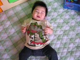 日曜日、今日もジュニアとの時間、充実していました今日は、母が妹(海外在住なのです)のところから帰国したので、久々にジュニアを連れて、母宅へ遊びに行きました。最初は母を見ても、「誰?」&見慣れぬ部屋でそわそわ状態でしたが、そもそも愛想のいいジュニア、しばらくすると、我が物顔で部屋中をハイハイ(ちょっとづつですが・・・^^;)、背這い、寝返りを駆使して、移動しまくり、楽しんでおりましたさらに、母に対しても、ニコニコ、キャッキャッで、母も大喜び!これまた久々の母親孝行ができました。しかし、さすがに気を使ったのか、疲れたのか・・・帰宅してから、すっかりダウン機嫌も悪く、お風呂に一緒に入ったのですが、ずっと泣いておりました。いや~、お風呂に入れるときに、最初から最後まで泣かれちゃうのは、初めてです。すっごく疲れていて、すぐにでも寝たかったのでしょうねぇ。でも、汗かきのジュニア、お風呂に入らないわけには、いきません。ごめんね。でもでも、君のおかげで、君のおばあちゃんはご機嫌で、今日はすっごく楽しかったみたいだぞ!ありがとう、ジュニア!で、写真は、母宅へ出発前のジュニアです。「◆7月中旬~7月下旬入荷予定分◆ベビールーム長方形6枚セット【セール期間限定】JTC ベビーサ...」の中で、「【子供服のPUTIMOMOベビー】超カワイイ~恐竜Tシャツ(2色)」を着ているジュニアです。なんでも食べてしまう今のジュニアには、ぴったりのデザインかと・・・^^;母宅では、たこ足のコンセントのコードを執拗に狙っておりました