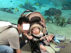 今回の旅行は2泊3日でしたそこで、中日は鴨川シーワールドへお出かけしてきました。早めに出るつもりだったのですが、ジュニア、朝からめちゃくちゃな食欲です。一番最初に朝食会場に入ったのに、食べ終えたのは、ほぼ最後の方でした。確かに、美味しいんですよね、食事が・・・。ジュニアがモリモリ食べちゃうの、わかるような気がします。さて、鴨川シーワールドです。ジュニアが生まれる前に、何度か遊びに行ったことがあり、動物園・水族館好きの嫁としては、子供ができたら、いろんな動物園・水族館へ行きたいということで、今回は中日に設定しました。本当はいるかにタッチなどしたかったのですが、さすがにジュニアには無理。で、いるかのショーなどを見せていたのですが、興味、どうも今いちみたいでした水族館の方がおもしろいのかな。水槽は熱心に見ていましたよ。多分、いるかショーは、うるさいのでしょうね。どうしても、調教のお姉さんやお兄さんが声を張り上げて、ショーの説明やら掛け合いやらをしているので、それで、いるかそのものに興味がいく前に、うるさくて、イヤって、なったみたいです。で、せっかくですので、水族館の中での写真をどうぞ。それと、こちらがいるかのプールの前です。ほとんど、いるかさん、写っていませんが・・・^^;実際問題としては、ジュニアが大喜びというよりは、僕と嫁が楽しかったシーワールドでした。なお、ジュニア、3時くらいにはお休みタイムに入り、宿に帰るまで、爆睡君でございました