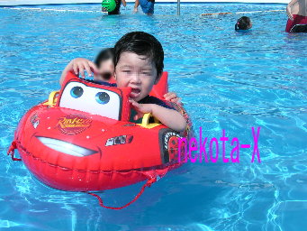 ということで、いよいよリベンジ編です何にリベンジかというと、7月上旬に、ジュニア初プール&初海ということで、チャレンジしてきたのですが、天候が悪かったせいもあり、あえなく撃沈!水を楽しむというよりは、水にやられたって感じの7月だったわけです。そこで、満を持してのリベンジということで、またまた今回もホテル伊豆急さんにお邪魔しました。出発当初は今回も天気がやばいかなと心配していました。が、そんな心配はなんのその、ジュニアのリベンジ魂の熱さのせいか、滞在中は予報は曇りでも、実際は晴れ~でして、たっぷりと水を楽しんできました。で、まずはプール!というわけですが、僕らの予想以上に、ジュニア、プールを堪能していました。びびっていたのは、最初の数分だけ。子供用プールで、ジュニアの身長でも立てるので、あとは縦横無尽に歩き回っておりました。ときどき転んで水中の没していましたが、それはご愛嬌ということで・・・でも、すぐに復活して、またまた水中歩行を楽しんでいました。で、なぜかお気に入りが、如雨露で頭から水をシャワーのようにかけてもらうこと!如雨露が空になって、ジュニアに渡すと、自ら水を汲んで、僕に渡して、「かけろ」のジェスチャー! で、頭からかけてあげると、「ウゴゥー!!」と叫びながら、プールの中をぐんぐん歩き回っておりました傍からみると、ちょっと?ですが、本人は楽しかったみたいです。そんなジュニアのプール写真です。もう1枚。こちらはプールサイドで、「どうだ!」というジュニア^^;とりあえず、これでプールにはリベンジ!水遊びの楽しさを覚えてくれたみたいですね。いやいや、ジュニアだけでなく、実は僕が一番楽しんだかもです。ありがとうな、ジュニア!次回は、海にリベンジ編でございます。