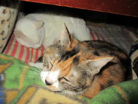 「さき」がケージ内のホカぺでまったり♪ さき「ん?なんじゃ?」 カメラに目…