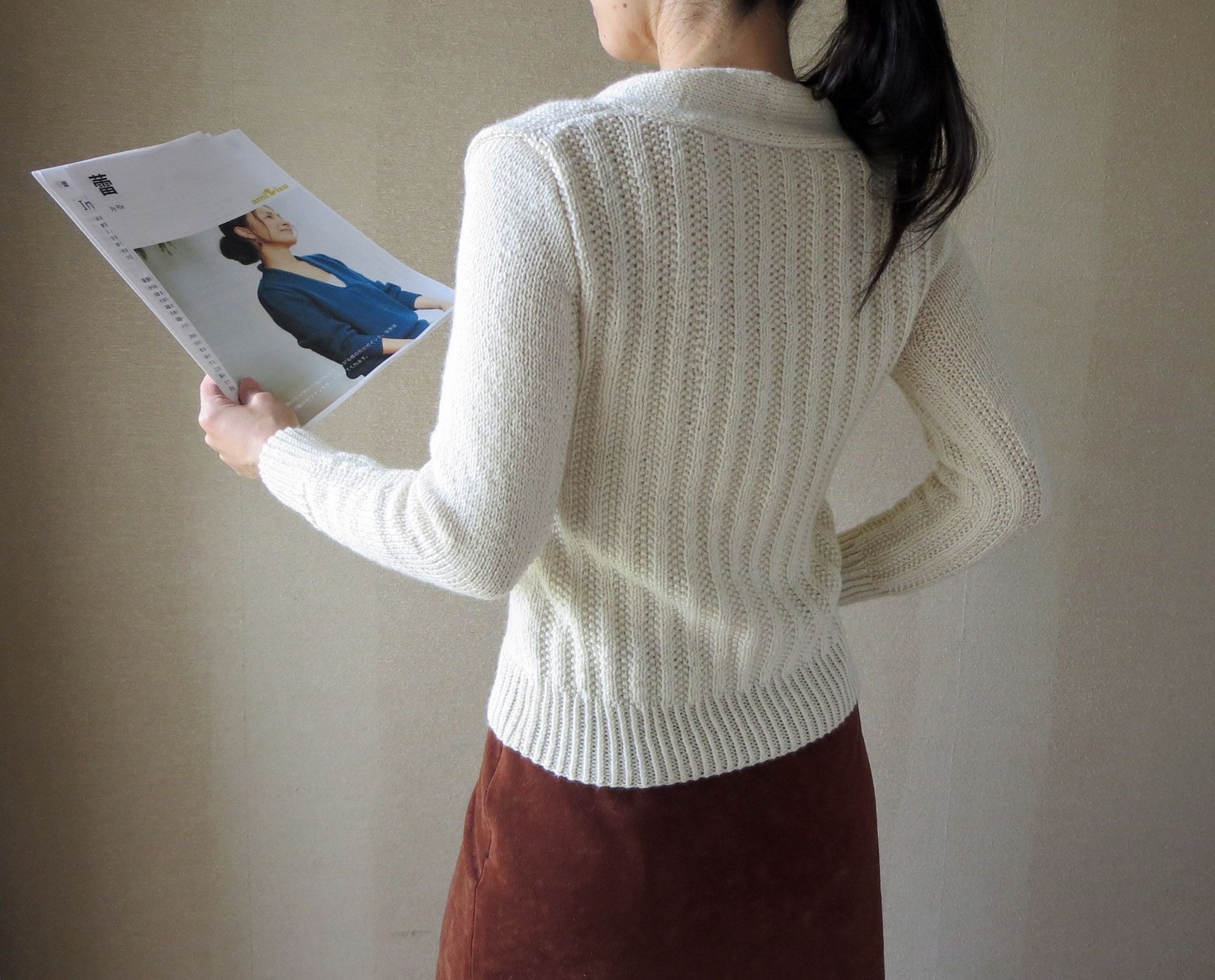 前身頃のメリヤスと後ろ身頃の模様編みで縦ゲージが違うからなのでしょうけれど、くるくるしちゃう編み地でぴったり○cmって測るのがけっこう難しいので、日本式に○段ってはっきり書いてくれている編み図はなんて楽ちんなんだろうと思いました(笑)