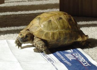 なぞかけしたまま、更新せずに帰国してしまいました。インターネットのプロバイダー(Co○cast)が、予定よりずっと早く回線を切りやがったので、帰国前数日間はネット使えず。「水曜日に解約でお願い」、「OK、水曜日に解約ね」、とちゃんと確認したくせに、日曜日には切りやがる。アメリカ仕事。まあ、もうオサラバ(多分)。で、日本に持ち込む物品で、刀よりずっとややこしいのが、私が飼っていたリクガメ。うちにはギリシャ・リクガメの「アキレス」がいたんですが、リクガメは全種類、ワシントン条約によってその輸出入が厳しく規制されてます。持ち帰るのが不可能ではないんですが、ブリーダーによる出生証明、アメリカ政府の輸出許可書、獣医の健康診断書などが必要になります。持ち込んだ後も、書類を役所に提出する必要があるとかで、ホント大変です。アキレスの場合、チェーン店のペットショップで買ったので、ブリーダーの出生証明なんてとれっこない。ギリシャ・リクガメは、日本にも大量に輸入されていて、ペットショップでも売ってますが、とにかく書類がないと一切輸入は不可。アキレス君、♂、推定6歳日本に持ち込むのは、ほぼ不可能ということがわかったので、じゃあもう勝新みたいにパンツに忍ばすしかないなと思いましたが、就職したし、子供もいるし、もうそんな危険な橋は渡れないので、泣く泣く動物好きの知り合いの方に引き取ってもらいました。幸い、とても大事にしてくださっているようで、安心しています。彼とも5年以上苦楽を共にしましたが、お互い別の道を進む時が来たようです。またいつかシアトルに戻る時に再会する事を楽しみにしてます。