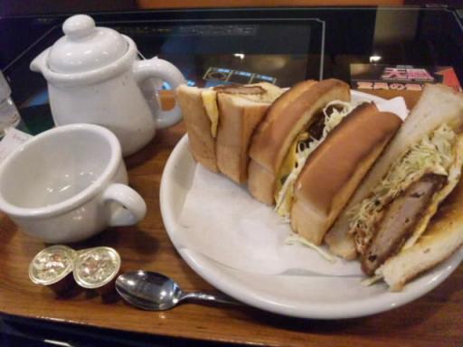 味噌カツに卵焼き、キャベツの千切りが満載にトーストサンドしてあります。