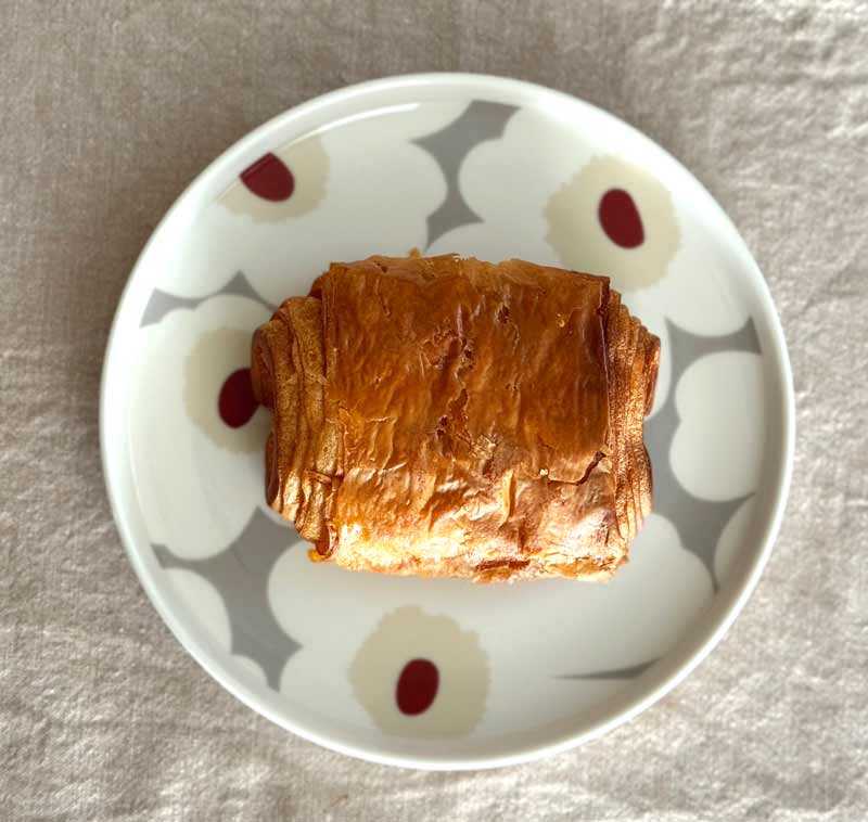 エキュート品川にあるヴェラーチェ パネッテリア ガストロノミアのスイートなパンです。パンオショコラ 1個 460円(税込) 外側がパリパリ、紙のような薄さでバターの風味。中には薄くパン生地で巻いてある感じで、中にビターチョコレートが入ってます。翌日のお昼に食べましたが、美味しいです。生地は甘さを抑え外側パリッと、チョコもビターに甘さ控えめ。生地の甘さを抑えることで中のチョコレートの特徴が引き立つ、計算された大人っぽいディニッシュパンです。暑い中、美容室に行って帰りにゴミ当番のゴミ容器を持って帰って、35度の気温の庭で洗ったあとの美味しいチョコパンは最高に美味しいですね〜。夫に、またいろんな種類のパンをこちらで買ってきて欲しいなと思いました。