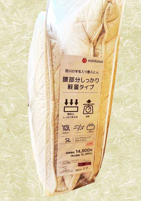 私の敷布団が欲しいので、イオンへ見に行きました。ちょうどブラックフライデー期間なのでお得かなと思い・・・。最初はトップバリュ製品を見ていたのですが、何やら昔と価格が違うのです。「なんか値段上がってない?」と夫も気がついていました。そうなんです、イオンのトップバリュ製品も値段が上昇していました。「価格差も大きくないから、西川の敷布団買ったら?」と言われて、生まれて初めて西川の寝具を買いました。嬉しいです〜。西川ブランドですから。購入したのはこちらです。西川の羊毛入り敷布団 腰部分しっかり 軽量タイプ 16280円(税込)素材の組成表です。日本製なのも嬉しいです。こちらは楽天ショップの商品です。イオンの商品とは若干機能や素材の%等違うようですが、生地の柄など似ています。【クーポンで1000円OFF】両面とも肌に優しい綿100%生地使用 敷布団 西川 シングル 三層式 フランス産 ウール 混 厚み約7cm 羊毛 側生地綿100% 羊毛混 三層式固綿入り 硬め 両面ウール入 敷き布団 シングルロング 合繊入りウール 100×210cm ウール 羊毛布団 敷き布団私は床にアルミシートを敷いて、その上にイオントップバリュのウレタンフォームの薄いマットレスを敷き、その上にベット用敷きパッドを敷いて寝ていました。アルミシートを敷いても、真冬だと窓からの冷気も床から流れてくるので、めちゃくちゃ寒いんですよね。もちろん窓にも冷気遮断のカーテンは冬だけつけています。少しはマシになります。ビニールカーテン 断熱カーテンライナー 遮熱カーテン あったか 保温 保温 節電 遮光 採光 断熱シート 省エネ 防寒 寒さ対策 冷気を防ぐ 断熱 窓 冷気遮断 抗菌 防カビ UVカット 無地 シンプル 透明 100×200cm 100×225cm 150×225cm 掃き出し窓 明和グラビア RSL「今年こそは暖かくして寝たい」と思ったので、今回この西川の敷布団を買いました。早速、イオントップバリュのウレタンフォーム+ベッド用の敷パッド、その上にこの西川の敷き布団を乗せ、ボアシーツをかけて寝てみました。とても良かったです。ちょうど良いふっくらさで暖かくて安眠できました。起き上がる時も少し床から高さが出るので、以前より楽です。ただし、敷きっぱなしにすると、湿気でカビが生えやすくなるので定期的にめくり立てて湿気を逃さないといけないと思います。イオンのトップバリュのウレタンカバーはカビが少し生えてました。アルミシートがよくないのかもしれません。アルミシートの使用をやめて、カバーを外して洗います。ダブルベッドはあるのですが、2人で寝ると窮屈、しかもスプリングが一部ヘタってきてるのか私が寝ると腰が沈んで痛くなるので、床に直接敷いて寝るようになりました。子供が大学院を卒業したら寝具類も新調することを考えているので、簡易的な状態にしています。