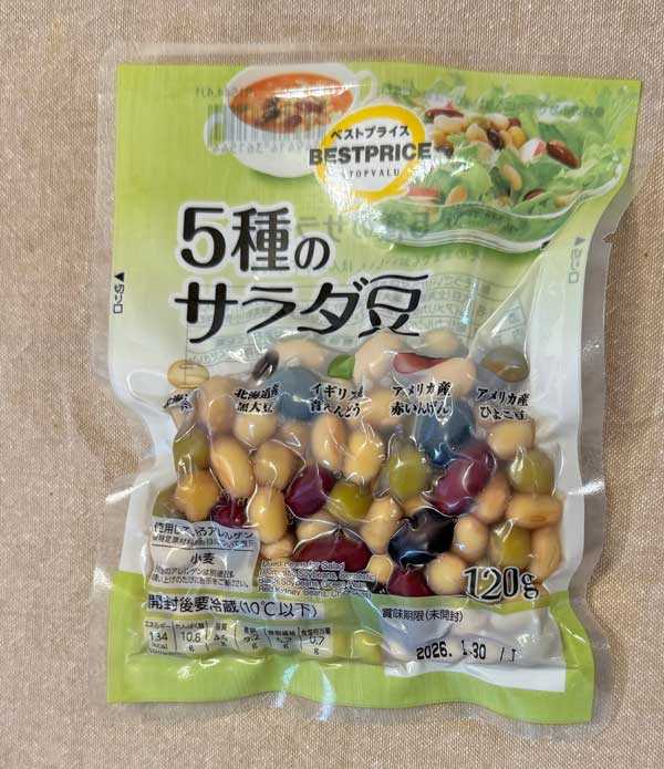 気に入っている、レトルトパック野菜です。イオンのベストプライス、5種のサラダ豆をサラダのトッピングに使ってます。以前はこういう食材は使わなかったんです。でもChatGPTに「血液サラサラ晩御飯メニュー」の献立を毎週考えてもらっていると、豆を使ったサラダがよく登場するようになりました。大豆の煮豆でも良いのですが、こちらの5種のサラダ豆は見た目も華やかになって料理が楽しくなるので、買うようになりました。ChatGPTのおかげで栄養も偏らなくなってきています。5種のサラダ豆-イオンのプライベートブランド(TOPVALU)そのまま食べてもうっすら味がついてるので、美味しいです。サラダに入れるとボリューム感UP。1パックで数日分あるので、2〜3日かけて2人で食べています。そのほかにこちらも買ってます。ベストプライス そのままサラダに使える蒸し大豆トップバリュ うまみとじこめ野菜 ささがきごぼう レトルトパック野菜って日持ちするから便利ですよね。以前は「絶対、畑で取れたそのままの状態が良い」と思い込んでいて、ストレスがかかってもそのままの野菜を買っていました。レトルト野菜は慌てて消費しなくて済むのでゆっくり料理を考えられるし、楽なので時々取り入れるようになりました。蒸し大豆-イオンのプライベートブランド(TOPVALU)うまみとじこめ野菜 ささがきごぼう-イオンのプライベートブランド(TOPVALU)