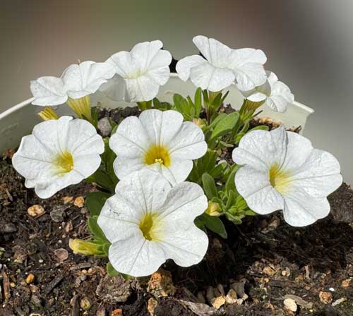 先日購入したカリブラコアです。白いお花のものはホームセンターDCMの「ぽんぽん咲くカリブラコア」ですが、一番真っ先に咲いてます