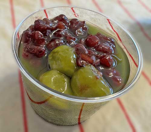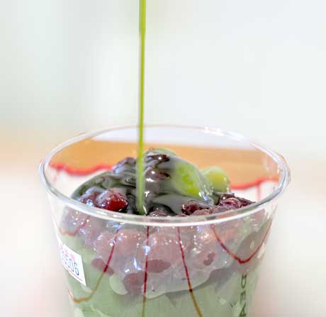 上に乗っている抹茶白玉と小豆あんを抹茶ゼリーの上にのせ、抹茶みつをかけていただきます ぽっ