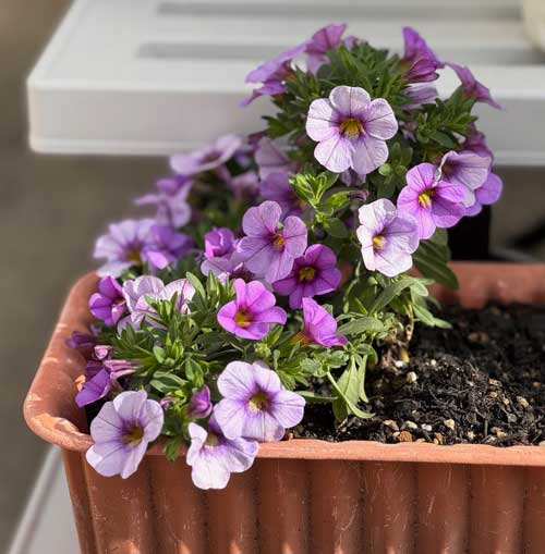 白いお花もいいなと選んだ、DCMのぽんぽん咲くシリーズのカリブラコア。こちらはなかなか茎が伸びていきません・・・。花は次々咲いてますが 。少し心配です。