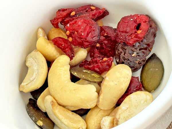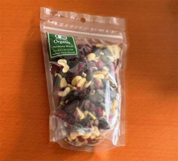 有機ローストカシューナッツ(ベトナム)、有機レーズン(アメリカ)、有機パンプキンシード(オーストリア)、砂糖漬け有機乾燥クランベリー(ラトビア)、有機サンフラワーシード(ブルガリア)です。