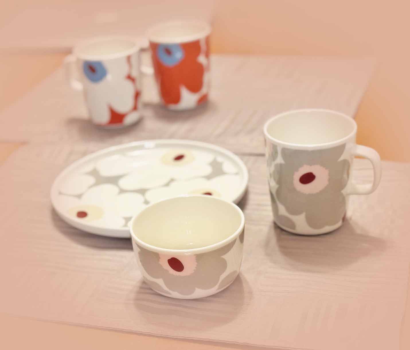 その他はマリメッコのウニッコ柄でマグカップ、プレートはピンク、グレー、レッドのカラーです。