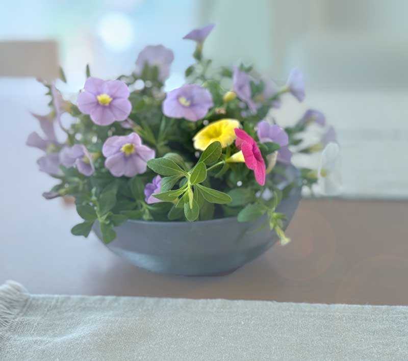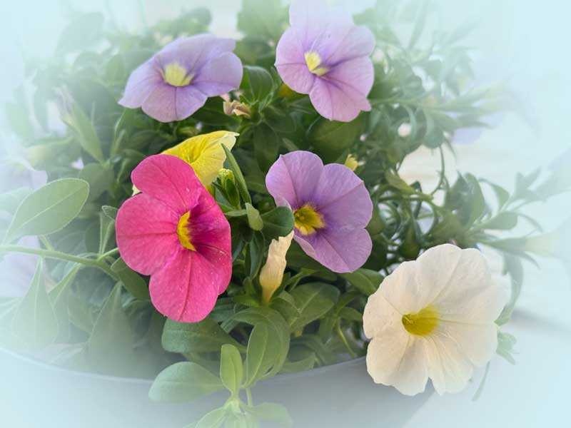 切り戻したカリブラコアの花がたくさんあり、捨てるのも勿体無いので器に飾りましたぽっ