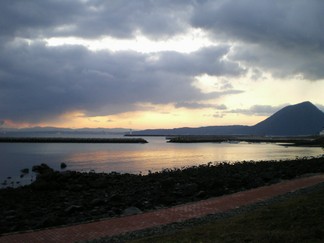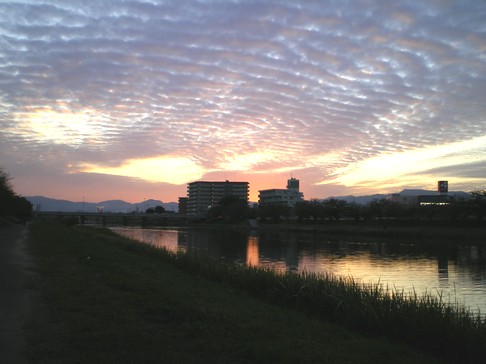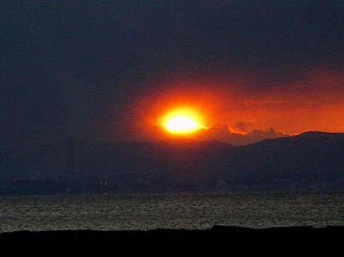 今日は、朝妻と娘と相談して別府大学駅から豊後豊岡駅まで歩くことに。9時半近くに別府大学駅を降りたところで、ウォーキングの列に遭遇しました。胸元には、行橋~別府100kmウォーキングのゼッケンがあります。話に聞いていた、100kmウォーキングのゴールを目指す人たちです。別府大学駅からですとおよそ4kmでゴールということは、福岡県行橋市(ゆくはし)から96kmを歩いてきたことになります。言葉少なめに、大勢の人たちが縦一列になって次々とゴールをめざして歩いています。年配の方や女性の方、若い方もいらっしゃいます。さすがに疲れた足取りの方もいますが、とても100kmを歩いてきたようには見えないほど元気です。約2500人を超える方が挑戦し、完歩率は50%を超える。1000人以上の人々が別府駅前を目指して、自分のペースで歩いている訳です。そのさまを見て、急に力をもらった気がしました。これほど多くの人たちが100km歩けるものなんだなぁと。同じ、ウォーキングをする者にとって、桁違いの挑戦のように思えました。自己最長といえば、湯布院への47km。おそらく60kmぐらいは歩ける気はするが、100kmとなると未知の世界です。むくむくと自分も歩いてみたいという気がしてきました。11時過ぎに豊後豊岡駅に着くと、そのウォーキングの列はまだ続いています。軽い昼食を摂り、自宅に12時前には戻ってきました。実は、前日にウォーキングでたまたま行橋~別府100kmウォーキングの頁を見たことも偶然の気がします。今年間に合えばエントリーしてみたいと思っていた矢先でした。今年は、10月11日にスタートして12日がゴールだったんですね。エントリーはしていませんが、コースと地図さえあれば何とかなるものです。探すとホームページがありました。今年は、既に募集は締め切られています。コースをダウンロードし、ゼンリンの電子地図でなぞっておよそ頭に入れます。最初は、行橋市内の海岸部を歩くルートで、あとは、ほぼ国道10号線を日豊本線に平行して歩くルートのようです。途中のリタイヤも考えて、駅が近いので交通手段でも問題はなさそうです。明日も祝日で休みですし、天気も問題ない。無謀ともいえる急な展開ですが、50kmのウォーキングはだいだい休憩いれて12時間。行橋を午後5時にスタートすれば、13日の午後5時には別府に帰ってくる予想です。当然、夜間も休憩を入れながらの24時間ウォーキングです。過酷なようですが、およそ時速4キロのペースを守れば、規定の27時間以内には、帰ってこれるのではと淡い期待があります。さっそくウォーキングに必要なテーピングやエア・サロンパス、飲料水、チョコレートや必需品の種抜き干し梅を購入。ホームページの手引きを熟読し、懐中電灯、電池、寒さ対策のウィンド・ブレーカーや着替えも用意し、お気に入りのカントリーの入ったIpodやデジカメをリュックに詰め込んで準備OK。徒歩で自宅を出発し、16時14分の大分駅発のソニックに乗り込みました。突然ながら偶然の流れのような、100kmへの挑戦が始まりました。歩く人たちに力をもらったのは確かです。不安よりも、できるような気がするほうが大きい。おそらく、一日たてば挑戦することもなくなる・・・。その日のうちに、行橋への電車に乗ったのも不思議ですが、いくつもの偶然が自分を誘ってくれたような気がします。機は熟していた。そんな思いです。17時16分に行橋駅に到着しました。☆行橋駅前(17.20)愛用のGショックのストップ・ウォッチをスタートさせ、スタート地点の駅近くの行橋正八幡宮に行きます。昨日は、2500人がスタートした境内も今はひっそりとしています。☆行橋正八幡宮(17.28)☆ここから、今川に沿った左岸の道を歩きます。コースでは、途中で井関を渡るのですが、日の入りも近いので、早めに右岸側に渡りました。☆多くの方が、釣りやウォーキング、犬の散歩で憩っています。今川河川敷(17.40)この後、最初の写真の夕焼け空を見せて、行橋市のウォーキングの開始は、たそがれ時にはいり、河川敷を抜けたところでとっぷり日は暮れました。ここからは、懐中電灯で地図を確認しながら歩きます。5km地点のゴミ箱には、ほぼ1時間の18時35分に通過。土地勘のない道のしかも、夜の道は心細い限りです。ルートの指示に従って、この先行き止まりの表示も気にせず進みます。途中、草むらの中の一本道を歩きますが、唯一、目新しいゴミが続いていることで間違いないことが分かります。マナーの悪さには閉口ですが、助かります。ここのえ牧場の看板を左折し、いよいよ長井の浜海水浴場をめざします。その2に続く。