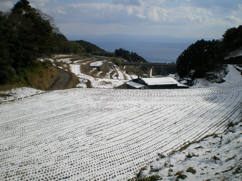 九州も寒波が到来し、土曜日の朝まで雪が降りました。平地は積もることもなくいつもの町の様子です。日曜日は曇りですが、せっかくの連休ですので、以前から行ってみたかった、ザビエルが歩いた道、西鹿鳴越(にしかなごえ)道を歩いてみることにしました。この西鹿鳴越道は、1551年に宣教師フランシスコ・ザビエルが、戦国大名の大友宗麟のいる府内(大分市)に入る際に通った道であり、江戸時代は、街道として人が行き交った道でもあります。旧街道とはいえ、昔から急峻な峠越えであったようで、今では登山コースとしてちゃんと整備されています。防寒対策と登山靴を用意し、10時前に自宅を出発。今回は、御近所の妻のお友達のヤッちゃんも初参加。登山口のある山田湧水横の駐車場に着くと、金曜の夜から降った雪が消えずに、棚田はしっかり雪化粧です。こちらでは、めずらしい「つらら」に娘は大喜び。当初は予想していなかった積雪の山登りですので、雪の深さを考えながら、無理はせず危険であれば、下山するつもりで山に入りました。ありがたいことに、登山口にはたくさんの杖が用意されています。お借りして、妻と娘とお友達、それに私の4人で雪山の初挑戦となりました。☆登山口での積雪は2cm程度でした。☆まもなく、趣のある杉並木の横を通過しました。☆しばらく歩くと、今度は石畳の道になります。石切り場の跡を右手に見ながら、ゆっくり登っていきます。まわりは、銀世界で積雪も5~10cmくらいです。きゆっきゆっと雪を踏みしめる音を聴きながら登ります。天気も、幸いに曇り空から快晴に変ってきました。☆西鹿鳴越道 雪を踏みしめて☆登り始めてちょうど1時間で、7合目付近の平坦な道に出ます。ここから、遠く大分市内が見渡せました。☆西鹿鳴越道からの眺望 正面のうっすらとした山が高崎山です。しばらくなだらかな道が続き、ゆるやかな坂を登りきると、ようやく峠を越えて下り坂になります。下り坂になってすぐに、分岐点の道しるべがありました。☆峠の分岐点に到着しました。今日は、七ツ石山に登る予定でしたので、ここで右折します。ここからは、少し傾斜がきつくなりますが、まだ、登り始めて1時間10分ですので頑張って歩きます。☆9合目付近 杉並木に赤でテーピングしていますので、迷うことはありません。杉の並木を間を抜けて、およそ20分で頂上に到着します。☆頂上が見えてきました。思わず足が速くなります。☆頂上でパチリ記念撮影です。12時25分に到着しました。ここからの眺望はすごくいいことは、ネットで紹介されていたのですが、予想通り、別府湾が一望に見渡せてとても綺麗です。☆七ツ石山からの眺望1 右側が別府市、向かい側が高崎山です。☆七ツ石山からの眺望2 手前が日出町 向かい側のうっすらとした陰が大分市です。お弁当を食べて、あったかいお茶で喉を潤しました。天候が急変してもいけないので、早めに下山です。下山は、靴が滑りやすいので十分注意しながら降ります。お借りした杖がとても活躍し、感謝です。あまり頻繁に杖をつくと、まるで座頭市のよう、峠を歩く様は、おしんのようだと笑いながら下山しました。☆ザビエルの通った道道しるべ 登山道としてちゃんと整備されていて気持ちがいいですね。☆石切場跡横を通過 下山もスムースに、どんどん降りていきます。駐車場のある山田湧水には、13時25分に到着です。湧水の柔らかく軽い水を飲んで喉を潤しました。☆山田湧水雪山ですが、登りが1時間半、下りが一時間のお手軽なコースでした。銀の雪道は、なんとも幻想的で、空気も澄んで心も洗われます。あまり深い積雪ではなかったので、幸運なことになんとか頂上まで行けました。今度は、緑のまぶしい雪のない時期に登ってみたいと思いました。今は、全国的に街道ブームになっています。江戸時代の旅人になったような気分で、旧街道歩きも楽しいですね。この西鹿鳴越道のほかに、東鹿鳴越道(殿様道)もあります。こちらも、今度ぜひ歩いてみたいと思いました。興味のある方は、日出町が地図をUPしていますので御参考に。童心にかえって、山で雪と戯れた一日となりました。(^^)