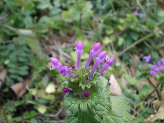 東別府の山手にある隠山(かくれやま)周辺をウォーキングしてきました。今回は、高低差がかなりあるので、娘は参加せず、夫婦でのウォーキングとなりました。東別府駅にウォーキングコースのマップを貼り出していて、以前から気になっていました。2コースあるうちの、赤松周辺は何度も歩いているのですが、隠山周辺は、まだ行ったことがなかったので、初挑戦です。ここには、石の観音様が並んでいるらしく、なんとなく会いたいような気持ちがしていました。東別府の浜脇の駐車場に車を止めて、浜脇中学校の横を坂を登り、旧道にぶつかると右折し、しばらくまっすぐ歩くと、宝満寺があります。ここの横から、急な坂道が山の方向に向かっています。けっこう、傾斜がありますので最初は息が切れます。☆山間の集落を歩きます。(東別府鍋地区)☆隠山周辺には、棚田が多く残っています。奥の山は高崎山です。(東別府鍋地区)気温は、かなり冷たいものの、既に道端には、春の野草が咲いています。☆カタバミ☆菜の花☆ナズナ野草観察をしながら、てくてくと里山を登っていきます。しばらく歩くと、柳地区の棚田がどーんと見えてきます。☆別府市柳地区の棚田柳地区から分かれ道になっていて、そのすぐ近くに、知恵地蔵があり、ここから、33体の観音像への近道の道しるべがあります。5分程度、舗装のない里道を歩くと、崖全体にいくつもの観音像を安置している不思議な光景が見えてきます。こんな山奥に、なぜ33体もの観音像を並べているのか、詳細はわかりませんが、ちょっと不思議な光景でした。☆崖をいくつもくりぬいて、観音様が安置されている。☆隠山の観音像ここで、しっかり家内安全などお参りしました。地図を見ると、隠山から小鹿方面まで行くと、別のウォーキングルートとぶつかるようですので、天気もよいので、もう少し登ることにしました。高速道路の下を抜けて、さらに山道を登ります。☆隠山から小鹿方面へようやく、坂を登りきると分かれ道に出ます。まっすぐに行くと、別府リンゴ園方面に抜けられるようですが、我々は、Vの字につながる右手の道に折れて、別府方面に戻るよう別の道を下ります。この道は、別府の朝見方面につながるハイキングルートになっています。下り始めて、しばらくすると、眼下に遠く別府湾が見えてきます。この近くで、お弁当を開いて昼食にしました。☆遠くに別府湾が見渡せるこの辺りから、杉木立の保安林として整備された中を歩きます。☆林道を抜けて吉備山の斜面に沿って、ハイキングルートを降りていきます。登りに比べて、下りは早いですね。次第に、別府市の市街地がどんどん近くなって、途中一望できる箇所がいくつもあります。☆ようやく、別府市街地がぐっと近くなってきました。しばらく歩くと、朝見の別府市の浄水場横に出ます。ここから、山沿いの旧道を戻ると、登り始めた場所につながりました。本当に静かな山間のルートで、途中ほとんど車にも出会いませんし、森林浴にはもってこいのルートでした。ただし、途中結構ゴミが散乱していて、マナーの悪さには閉口しました。もう少し、道しるべを増やして、ハイキング・コースのでこぼこ道を整備すると、もっと楽しめるコースになるのではと思いました。登りが1時間半、下りが50分の12kmのウォーキングでした。