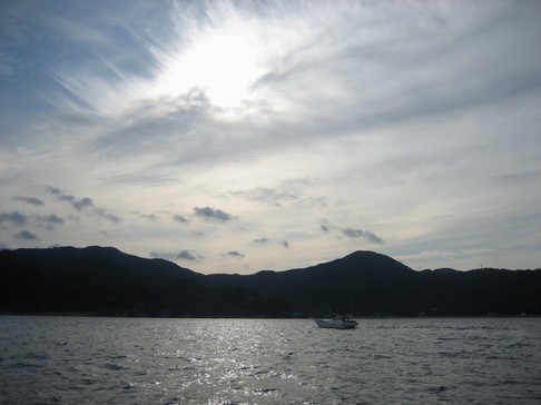 午後4時過ぎから、速吸の瀬戸こと豊後水道で、関アジ、関サバ釣りに挑戦しました。運がよければ、ブリの大物も釣れるとのことで、期待して釣り始めたのはよかったのですが、釣り始めて、開始1分で、ゴツンと大きな当たりが・・・。ところが、とたんに静かに・・・。恐る恐る糸をあげると、仕掛けが持っていかれてました。岩場へ逃げ込んだ時に、よくこうなるとか。逃した魚は大きいとはよく言ったもので、その後は、魚に嫌われてさっぱりの状況。小アジが釣れたのみで、一緒に釣ったAさんは、中型の関サバを釣り上げました。☆漁船のオーナーのIさんのオススメポイントへ。潮で、船が流されるので、魚探で群れのあるところへ、どう垂直に糸を垂らせるかが、ポイントのようです。船釣りは、指先に集中して、動きを感じる繊細さが必要で、釣れずに焦ってくると、ダメですね~。ちょっと残念でしたが、大自然の中で、釣りができたことが一番の幸せでした・・・。ということにしておきませう。(~~;)