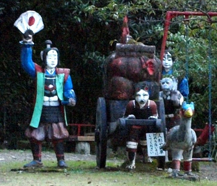 【桃太郎公園】 三千年に一度しか実をつけけない桃伝説※神秘的な空気に包まれて ◆桃太郎公園(愛知県犬山市)は、「飛騨木曽川国定公園」内にあり、桃太郎伝説を伝える桃太郎神社を中心に、木曽川(日本ライン)に沿って自然の景観を活かして造られた広大な芝生広場と、春は桜、秋は紅葉がとてもきれいな公園です。また、桃太郎公園内には、「桃太郎のきびだんご」などのおみやげや「菜めし」「でんがく」の美味しいお店がたくさんありました。★桃太郎神社の桃鳥居をくぐれば、悪は去る(猿)、病いは去ぬ(犬)、災いは来じ(雉)と言う「桃」が持っている神秘の言い伝えが--。中国では、古くから桃が「仙果」として、神仙のための貴い果実して位置づけられてたようです。三千年に一度しか実をつけけない桃を、西王母(崑崙山に住むとされる女仙)が、漢の武帝に食べさせたという話もあります。その影響か、日本でも魔よけの力がある果実として解釈され、『古事記』では黄泉の国から逃げ帰るイザナギノミコトが黄泉軍に桃を3個投げて撃退したという場面が登場します。つまり邪悪なものを桃の力で追い払うわけです。さらに桃には、その姿形の艶めかしさから、古くから出産、豊穣のイメージもありました。 桃を食べたお爺さんとお婆さんが若返って桃太郎を生んだという一説は、このことに由来するようです。【豆知識】 実は超メジャーな神社見た目はファニーな神社ですが、常陸の宮様ご夫妻が1965年の8月に訪れられ、詩人・作詞家の野口雨情氏も「犬山桃太郎音頭」を作詞、全国桃太郎サミット第2回大会(1999)では第1回の東京会場に次いで開催地に選ばれるという有名な場所なのです。