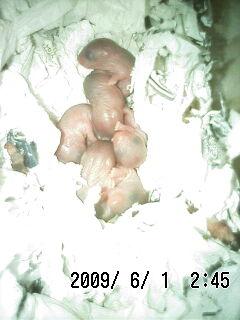 今頃だが、ぷる吉の産んだ子の2日目の写メを。どうでしょう?最初何も知らずにぷる吉の下にこれを発見した時は内臓でも出ちゃったのかと焦ったものだ。ちなみに、これは妻が撮ったものである。。。「ハムスターは子どもを産んだ後、子どもに人間が触ったり、刺激を与えたりすると、子どもを食べてしまう」というので、私はかな~り慎重にぷる吉に接しているのだが、妻は結構、お構いなしである。ちなみに世話をしているのは私だけである。まったく、飼い主が子どもをほとんど見ていないというのに・・・。産まれてからと言うもの、地下室型巣箱を開けるのが毎回恐ろしくもあり、楽しみでもあり・・・。とりあえず、生き残っているのを見るとほっとしつつ、蓋を開けたことがきっかけで食われはしないかと・・・。ちなみに、写真を撮ろう撮ろうと思って取り損なっているが、今は毛が生えてジャンガリアンらしい背中の一本線も入っている。歩くのはまだよたよただが。それにしても、ハムスターの性格とは結構変わるものである。以前は人懐こかったさくらの方は脱走事件以来、すっかり臆病者になってしまったし、一方のぷる吉はやたらと人の手に上りたがってくるし。
