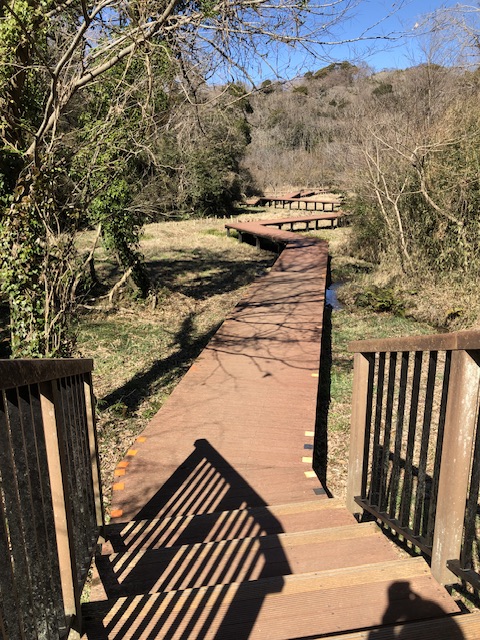 夕方うちに帰りましょうという音楽が聞こえてくる頃遊び疲れて真っ黒になって帰ってくる子供のように、ご隠居と2人毎日遊び呆けている。車を駐車場に置いて海辺の網代が作る森の中に分け入る。長い階段を降りて干潟に続く湿地の木道を歩く。1km以上続くちょろちょろ小川が流れる湿地帯を抜けるとヨットハーバー。手前の干潟にアカテガニが居ると思う。あちこちで砂の中からぶくぶくと空気が出てくる。さて、帰りは違う道を。今度は作られたさっきの道と違う自然に近い山道の階段を一気に登る。息も絶え絶えになった頃。急に開けて大根畑。振り向けば富士。良いなあ富士山、いつまでこの美しさでいてくれるんだろうか。晴れた日、遠くに大島も見えた。
