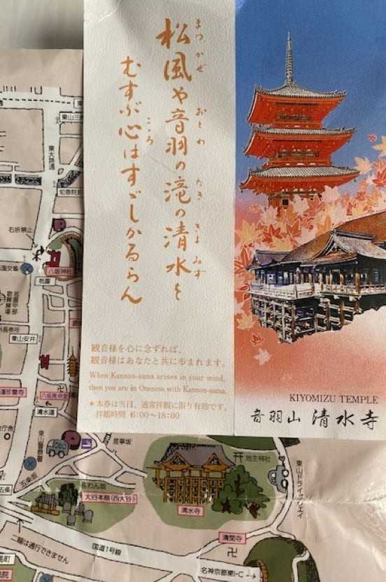清水寺の入り口で頂いた地図と入場券。778年に僧・延鎮が音羽山の滝のほとりに観音…