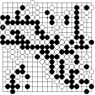 この局面で、私は1に駄目をつめてしまったのです。右下や右辺に白から劫材があり、もう黒は勝てません。右辺の白に目がないので、ここはセキになればセキ崩れで全部取れるのです。だから、Aと普通に劫を争えば寄劫ですから負けようがないのです。それに気づかなかったとは信じられない錯覚です。人に地を一目も作らせないH君の打ちまわしにあって、相当疲弊していたようです。