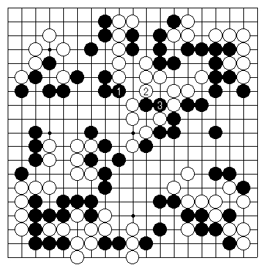 前回の問題局面 変化図1 です。2で1の右に押さえるのは、上を一本出てから真中のぞきくらいで味良く死にです。変化図1の3の手をうっかりしました。次にポン抜くと、上の切りとあたりが見合いになるので、白は脱出できません。白2で外に出ようとすると、 変化図2 で上辺の石が取られます。この形は以前にもうっかりした事があり、盲点に入りやすいようです。黒1で、単純に外を止めても白かなり危ないですが、白1に対して伸びて受ける余裕はないので、やや味悪です。